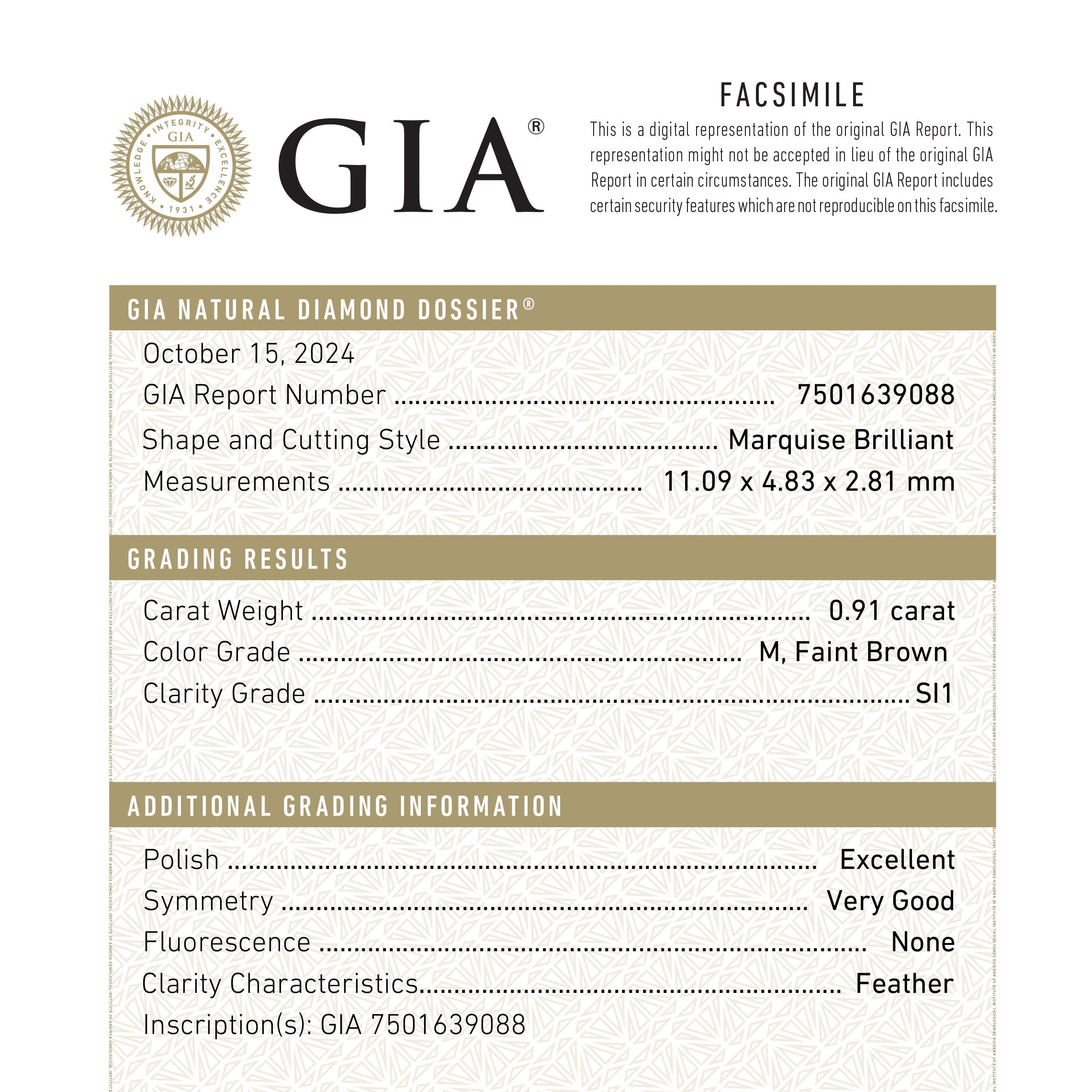 0.91ct 11.09x4.83x2.81mm GIA SI1 M Marquise Brilliant 🇨🇦 26592-01